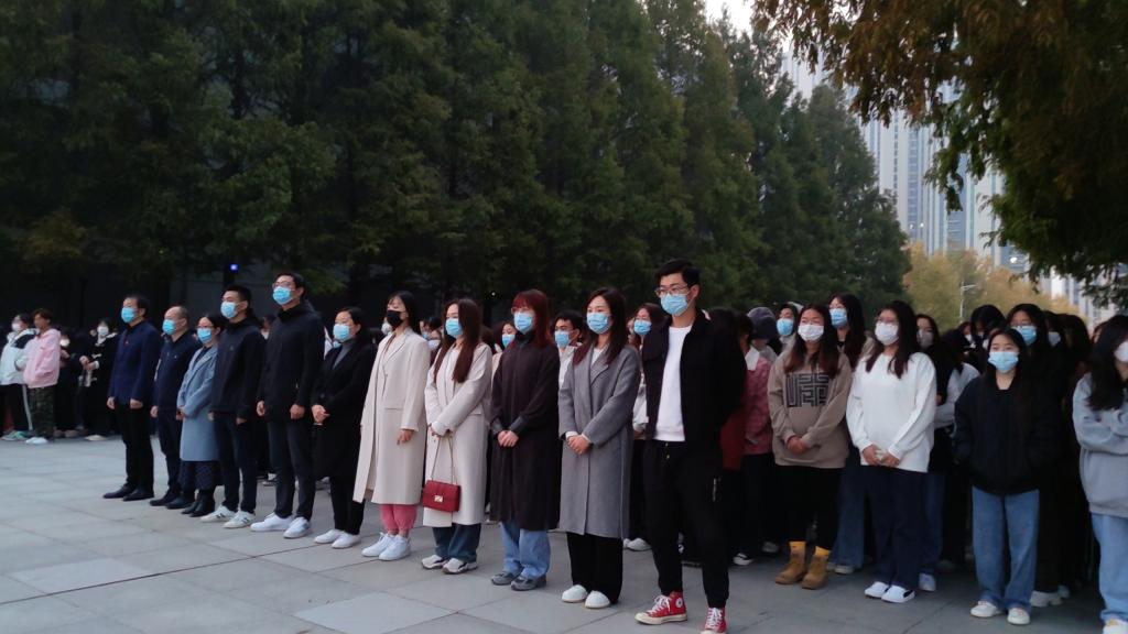 6点25分,升旗仪式正式开始。国旗护卫队队员们迈着铿锵有力的步伐走向国旗台。伴随着激情高昂的国歌声,五星红旗冉冉升起,全院师生面向国旗奏唱国歌,深情表达对祖国的热爱。