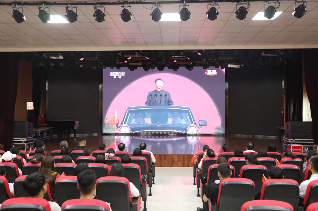上午十点整,国庆庆典正式开始,当国旗升起,国歌奏响的那一刻,在场的师生自发起立,同唱国歌。随着阅兵中一个个方队的出场,观看现场一次次进入高潮,现场洋溢着欢乐的氛围,与会师生们用他们热烈的掌声和满怀豪情的赞叹声表达着对祖国深深的祝福。