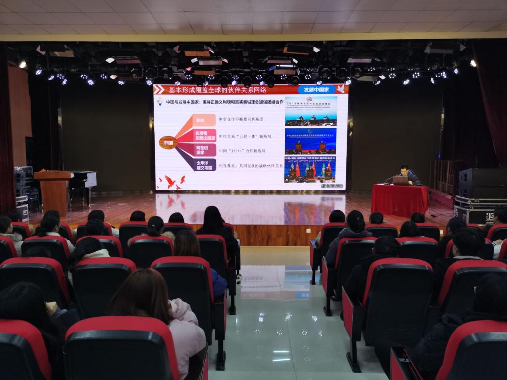 团课上,崔彤彤书记分别从中国外交的历史性成就、中国外交的优良传统和鲜明特色、开创新时代中国特色外交新局面三个方面入手,详尽细致地阐述了中国在外交方面的作为和担当。通过一桩桩历史事件,对中美关系、中俄关系的剖析,引发出对“推动构建人类命运共同体”,“一带一路”倡议等问题的思考。崔彤彤书记还指出,中国将高举和平、发展、合作、共赢的旗帜,恪守维护世界和平、促进共同发展的外交政策宗旨,坚定不移在和平共处五项原则基础上发展同各国的友好合作,推动建设相互尊重、公平正义、合作共赢的新型国际关系。
