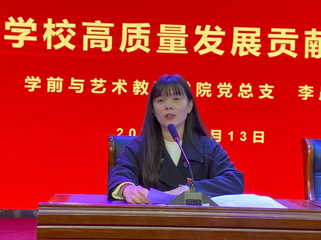 教学办主任李晨阳以“发挥党员先锋作用,为学校高质量发展贡献力量”为主题进行汇报讲话。她说到,作为一名党员教师,一是在思想品德上要向高标准看齐,学习工作谦虚谨慎、刻苦扎实,促进学校优良教风学风的形成;二是紧跟学校发展步伐,刻苦钻研教学科研业务,积极投身学校教育教学改革,不断提高教育教学质量;三是坚定理想信念,坚守廉洁底线,充分发挥党员的先锋模范作用,总结教育教学经验,开展教育实践,探索教育规律;四是聚焦职教发展新要求,锤炼立德树人新本领,增强改革创新新能力,激发全力以赴新干劲,全方位服务学生发展,以此助推学校高质量发展。