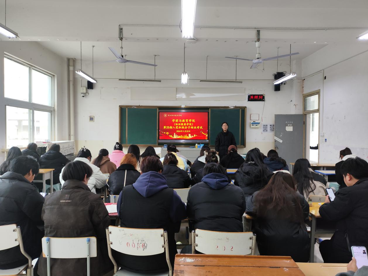 11月22日下午,学院组织开展第二十五期入党积极分子结业考试。此次结业考试充分检验了入党积极分子在党课学习期间的学习成果,引导他们在理论学习和实践锻炼中深化对党的认识,端正入党动机,坚定入党信念,增强党性修养。