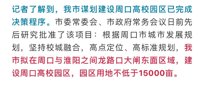 市委常委会、市政府常务会议日前先后研究批准了该项目:根据周口市城市发展规划,坚持校城融合,高点定位、高标准规划,我市拟在周口与淮阳之间龙路口大闸东面区域,建设周口高校园区,园区用地不低于15000亩。