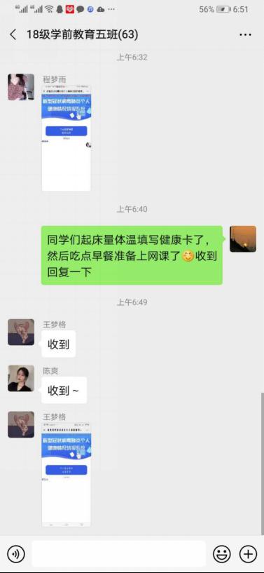 学生的健康状况更是不容忽视,有些同学上报的健康状况异常,在得知消息后,辅导员第一时间联系了学生及其家长,并向领导反映情况;当时田钰老师班级里有一名学生扁桃体发炎并发烧,她每一天都会跟踪了解学生情况,并按时上报,直到学生痊愈,才放下心。