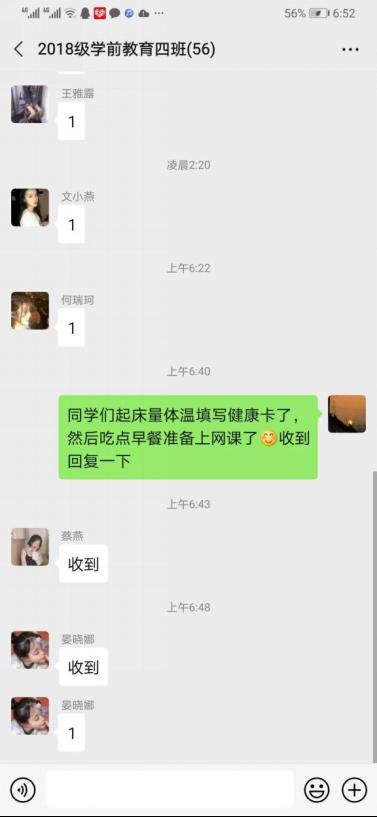 上午课程结束后,辅导员及时关注学生出勤情况,解决师生反映的突出问题,疏解学生情绪。如有旷课的同学,及时联系家长了解学生情况,微信联系不上,就一个个打电话询问。