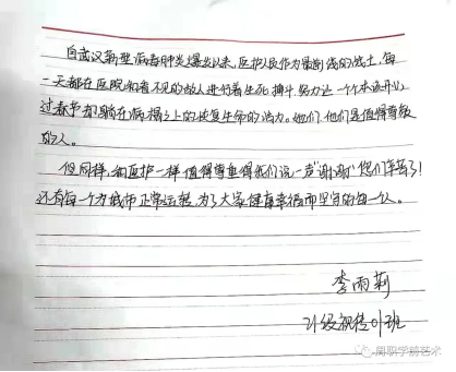 此次班会以班级为单位开展,由各班团支书上台讲解新型冠状病毒的症状、新型冠状病毒的传播途径有哪些、杀毒工具的正确使用、戴口罩的详细方法等,同时还引导了学生们应该如何正确面对疫情带来的恐慌情绪并给同学们讲述一个又一个感人的抗疫故事,同学们听到抗疫人员的故事后深受感触,对此次班会写出了感悟信。