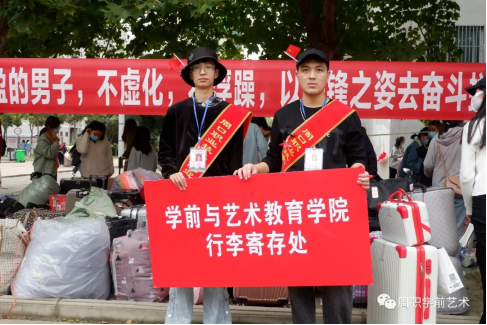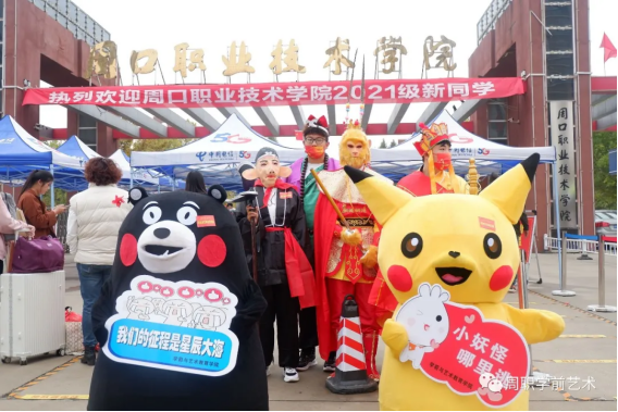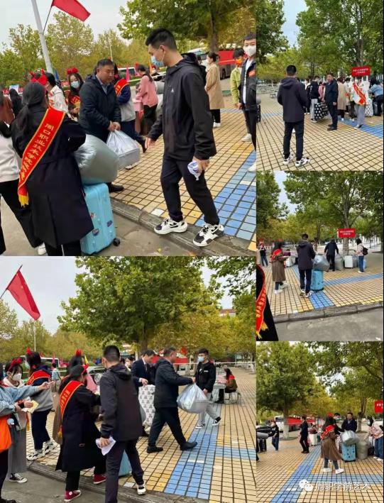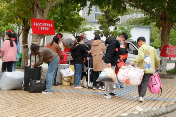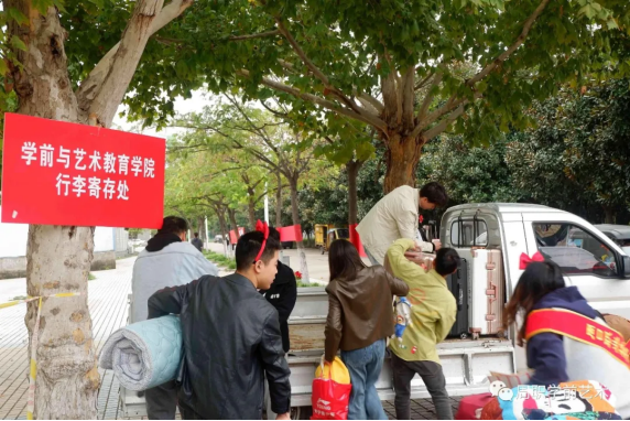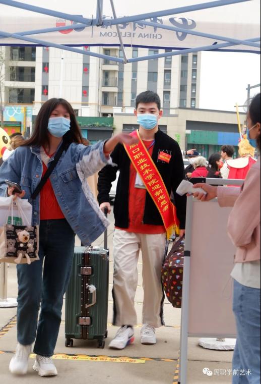 可爱的小萌新们经过扫码验码、体温监测、行李消毒、确认健康安全后方可入校,而在校门外学长学姐们穿着可爱的卡通玩偶和经典电视剧剧服在校门口热情迎接,他们“疯狂”上前“抢”过行李送到行李寄存处,然后用行李接送车把行李送到宿舍。