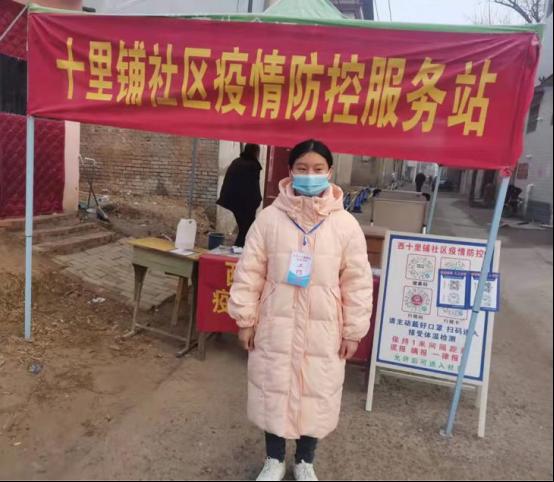 21级早期教育二班的谭圆梦同学,家住河南省郑州市,在知道疫情来临后,她积极配合家乡疫情防控工作人员,参与疫情防控排查,深入各家各户做好返乡人员登记,对返乡人员进行信息采集、健康监测,协助医护人员进行当地核酸检测和测量体温等工作。