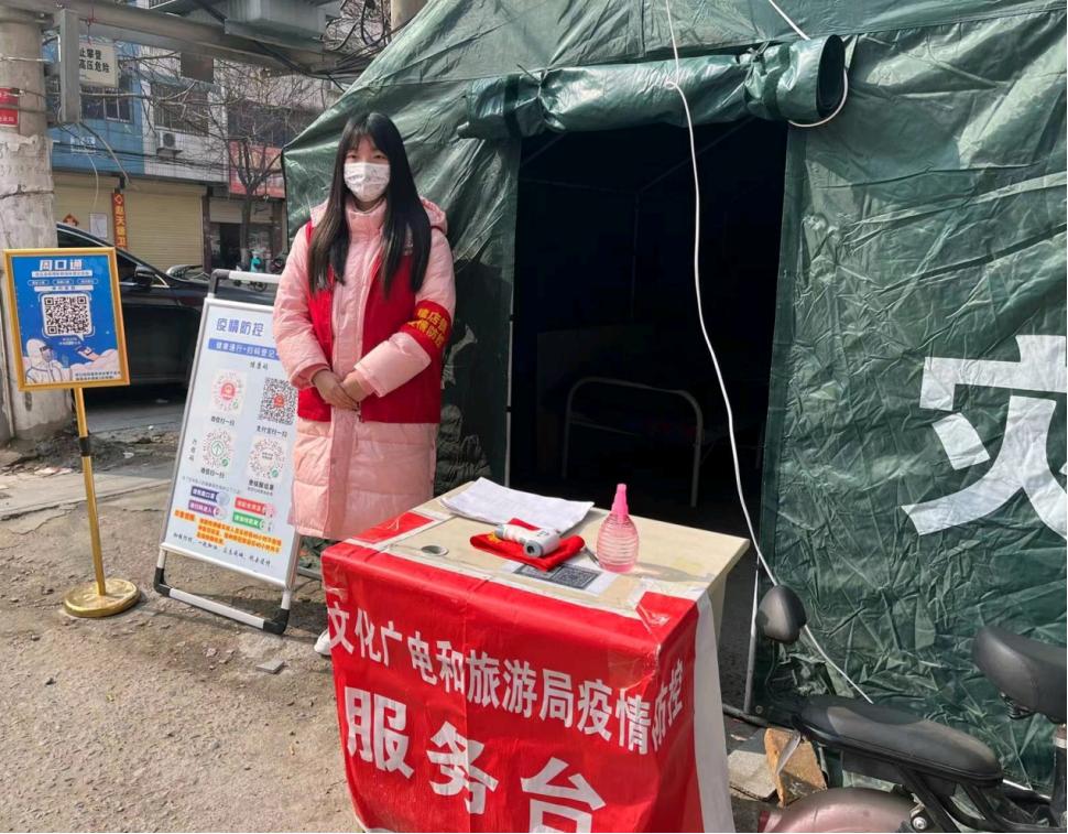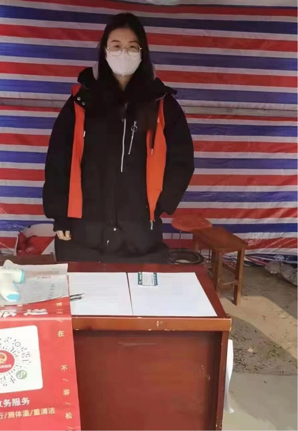 20级学前教育四班的黄小涵同学,来自河南省周口市沈丘县,在知道疫情来临后,积极响应号召,主动参加当地的疫情防控志愿者服务活动的队伍中。她的主要工作是负责协助当地的工作人员对外来人员进行信息登记,在疫情卡点处执勤站岗,查看来往人员的核酸检测报告、健康码、行程码并测量体温等。