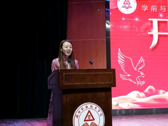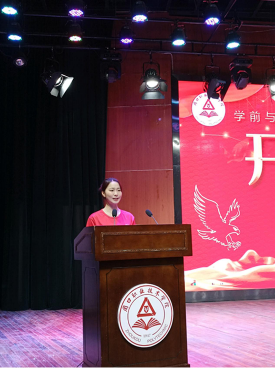 接着,22级学前教育3班卢慧同学作为新生代表发言。她说,意气风发的我们成了周职校园里一道新的风景线,朝气蓬勃的我们将成为学院成长之路上的新一代接班人,我们将在这里以青春为笔,描绘梦想的蓝图。