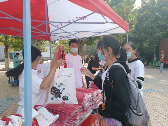 清晨6:30,晨曦初露,在学院党总支书记王春生、院长高岐奎的带领下,学院领导班子和全体21级、22级辅导员老师,迎新志愿者有序开展迎新工作,确保疫情防控期间新生顺利入学。扮演西游记师徒四人、“带着光的奥特曼”的学长们在学校门口为学弟学妹们接应指路,小萌新们通过扫码、测温、消毒进入校园,辛勤的志愿者们穿梭在帮助小萌新寄存行李到运送车上。学院还为22级小萌新们准备了精美的“开学大礼包”,有学院定制的帆布包,封面设计精美,正面的梅花寓意着学生们刻苦学习,梅花香自苦寒来,青衣代表着中国戏曲的国粹艺术,反面的泥泥狗是周口文化的象征,可爱迎新贴纸,降温解暑的矿泉水和苹果及学院领导、新生辅导员联系方式的暖心卡,并派专人带着小萌新们去往“月尊大人”新生报到处,他们以实际行动践行初心和使命,展示学院风采,成为迎新现场一道道亮丽的风景。