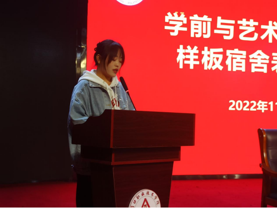 样板宿舍寝室长代表21级学前教育2班申新迎同学发言。她说:“能够评上样板宿舍,离不开宿舍成员的齐心协力,相互配合,此次样板宿舍评比活动,在无形中督促着我们,不仅让我们养成良好的个人卫生习惯,也让我们思考、学习到难能可贵的相处、相容之道。”
