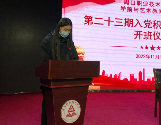 接着,21级学前教育五班项文静代表全体入党积极分子发言。她提到作为一名入党积极分子,应当高标准要求自己,并作出郑重表态:一是珍惜培训机会,提升素质能力;二是服从组织管理,遵守纪律规矩;三是纯化入党动机,发挥模范作用。我们新时代大学生生在党旗下,长在春风里,必将以更高的标准,更严的要求,更实的作风,更优的业绩,接受党组织和群众的考验,力争早日加入党的队伍当中来!