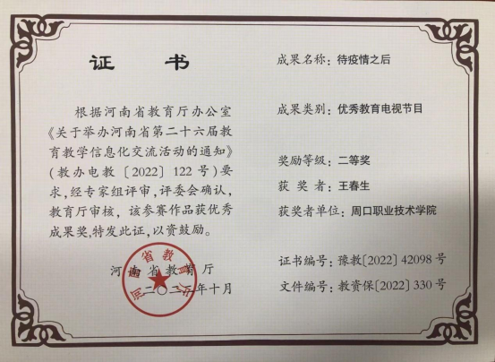46.10月15日,王春生老师荣获河南省教育信息化优秀成果二等奖1项。