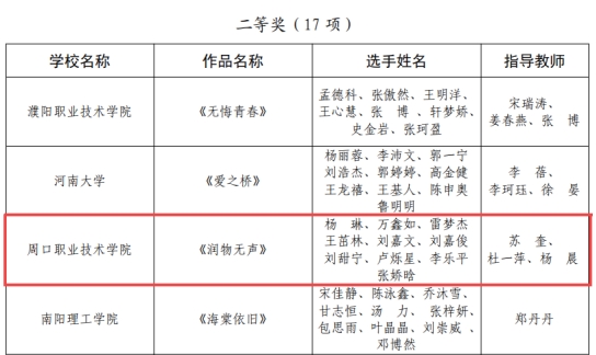 41.9月27日,由贝博官网王春生、高岐奎、杨晨、田钰等老师指导的作品《润物无声》《奋进》《鸡毛人逗蟾》分别荣获河南省第十八届大学生科技文化艺术节二等奖。