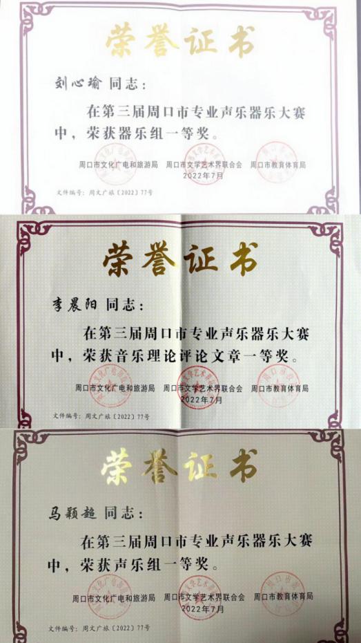 27.7月6日,刘心瑜、李晨阳、马颖超三位老师分别荣获周口市第三届专业声乐器乐大赛一等奖。