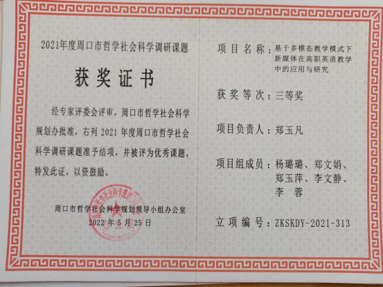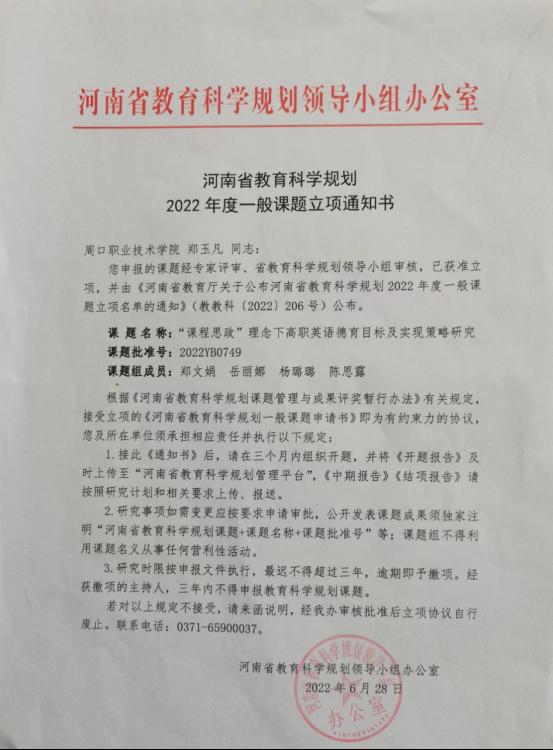 18.5月25日,郑玉凡老师获批立项河南省高校人文社科研究一般项目,荣获周口市社科联优秀调研项目三等奖。