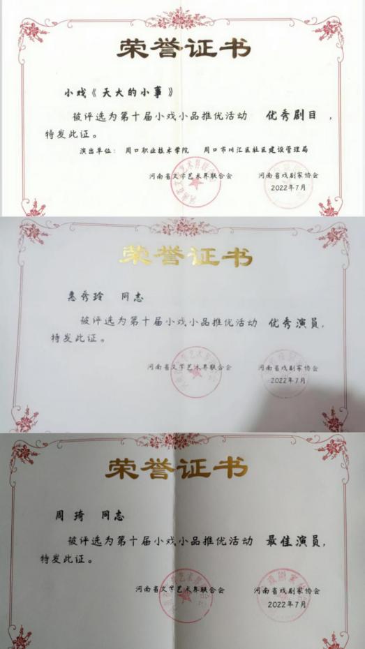 30.7月18日,贝博官网戏曲专业老师编排的戏曲节目《天大的小事》荣获第十届河南省小戏小品推优大赛优秀剧目,惠秀玲老师、周琦老师分别荣获第十届河南省小戏小品推优活动优秀演员、最佳演员。