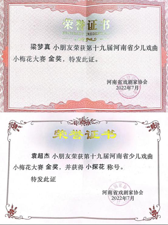 31.7月21日,贝博官网学生梁梦真、袁超杰分别荣获第十九届河南省少儿戏曲小梅花大赛金奖。