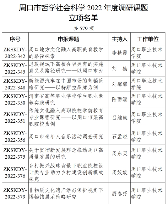 19.5月27日,刘楠、刘馨馨、石孟晓、李艳霞、周东灵、周姣姣、蔚春抒、吕维康、陆雨涵等老师获批立项周口市社科联调研项目。