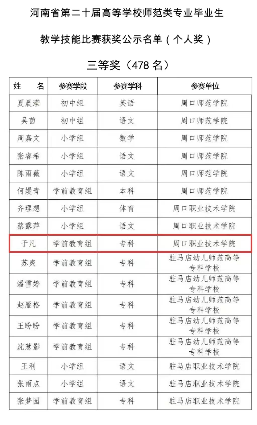 祝贺贝博官网20级学前教育专业学生于凡在河南省第二十届高校师范类专业毕业生教学技能比赛中荣获三等奖