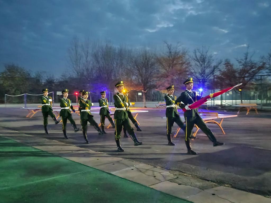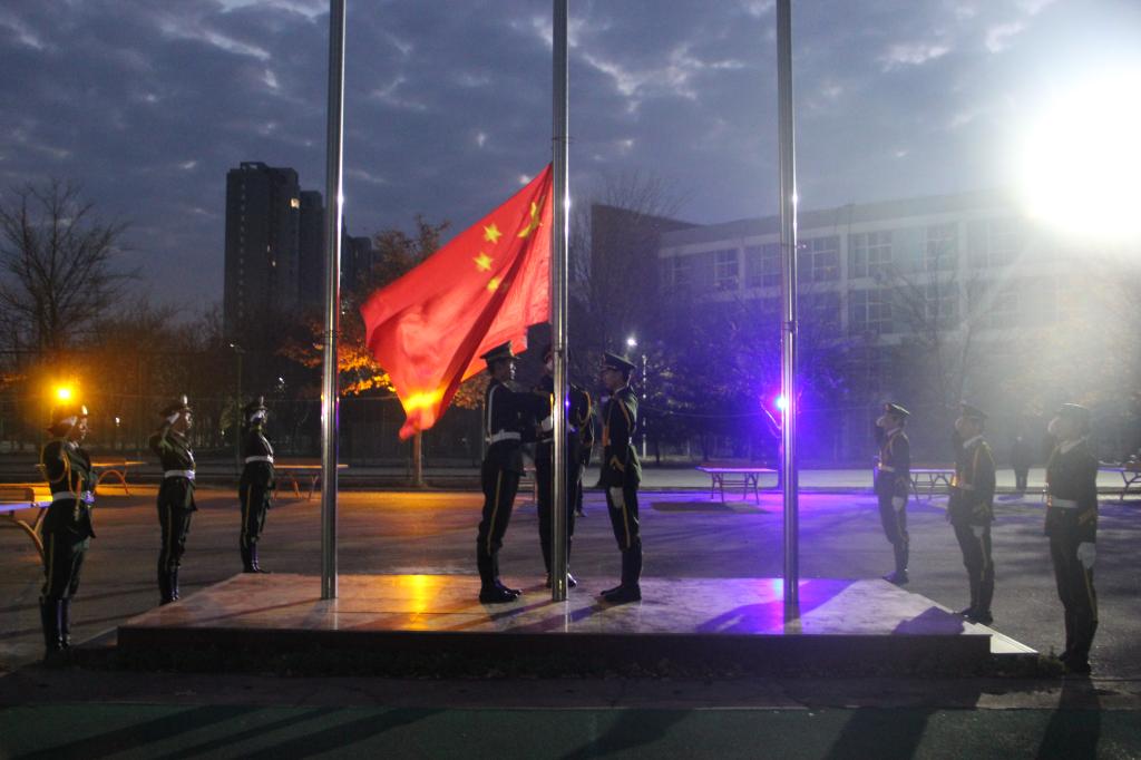 国旗护卫队迈着铿锵有力的步伐走向国旗台,伴随着庄严的国歌,全体师生肃然起敬,行注目礼,共同见证五星红旗冉冉升起。