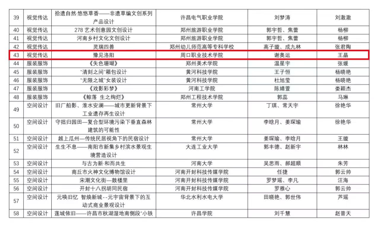 “创响中原”河南省大学生艺术设计大赛由河南省教育厅主办,旨在贯彻落实省委省政府关于“设计河南”建设的战略部署,持续深化教育教学改革,加快培养卓越设计人才,打造设计创新中心和人才高地,全面推进“设计河南”建设。贝博官网领导高度重视,积极组织专业教师带领学生参加大赛。近日,河南省教育厅公布了2023“创响中原”大学生艺术设计大赛的评审结果。贝博官网在此次大赛中荣获一等奖1项、二等奖1项、三等奖3项