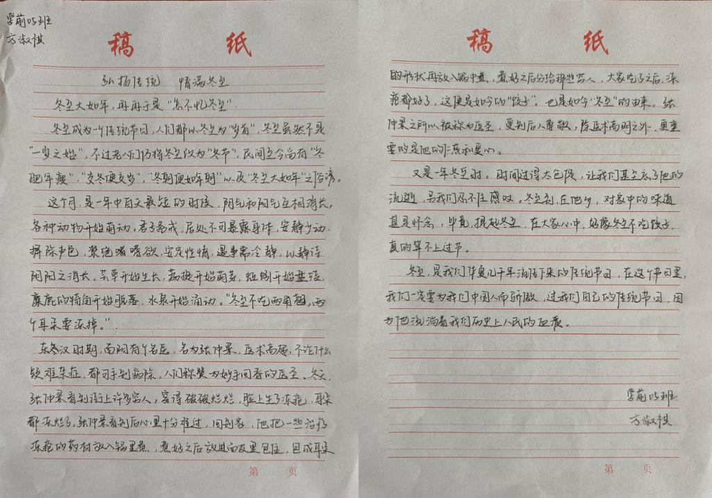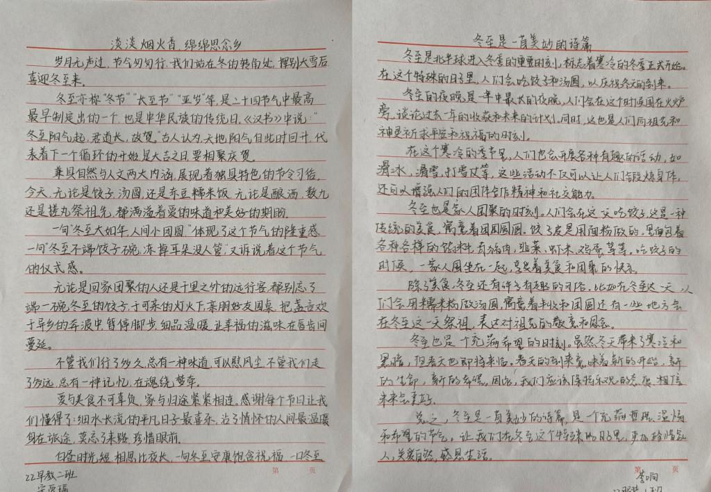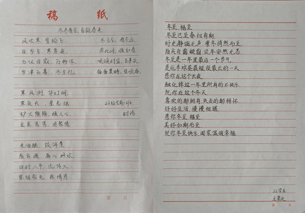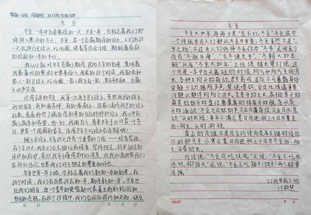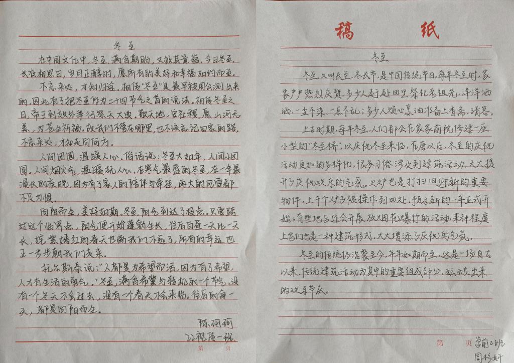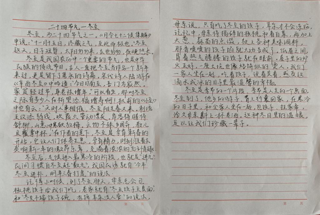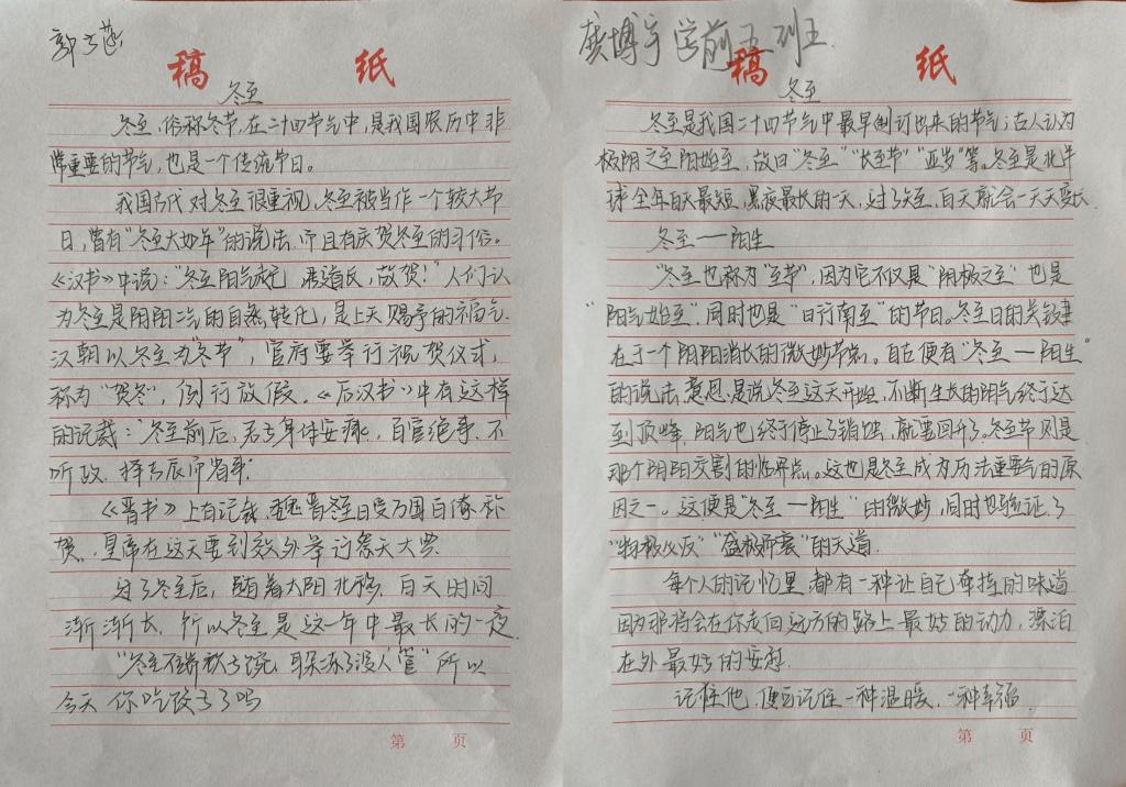 活动中,同学们查阅了关于冬至节气的相关资料,围绕与冬至相关的传统文化进行创作,通过文字书写,更加深入地了解冬至的文化内涵。接下来,让我们一起欣赏优秀作品的风采吧!