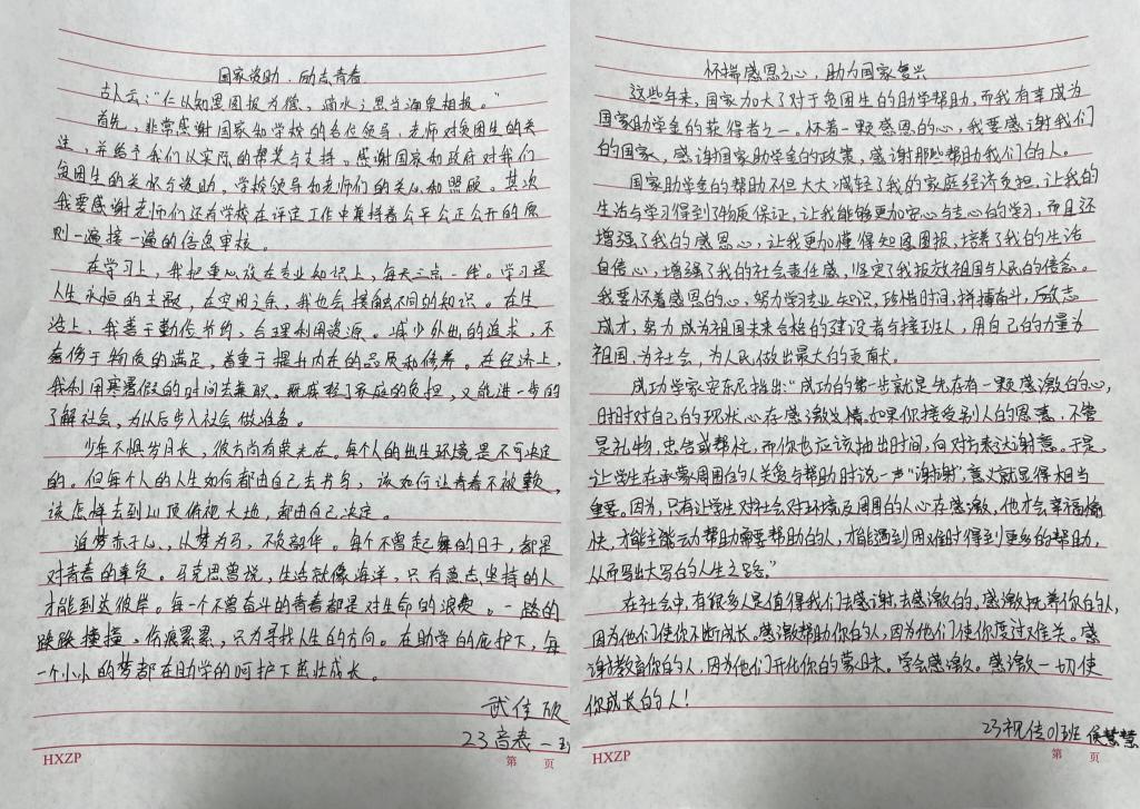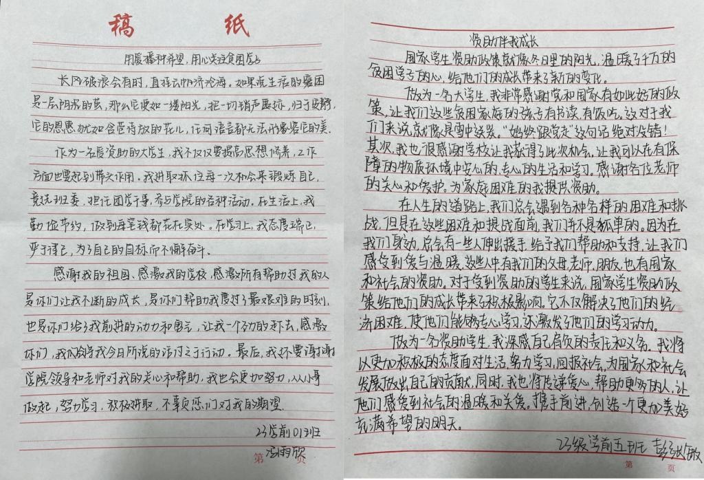为大力宣传国家资助政策及成效,进一步加强学生思想政治教育,激发学生爱国情怀,培养学生诚信感恩意识,10月16—20日,ballBET贝博BB艾弗森开展2023-2024学年第一学期学生资助“两节课”之“感恩助学,筑梦铸人”主题征文活动。学院全体在校生参加本次活动。
