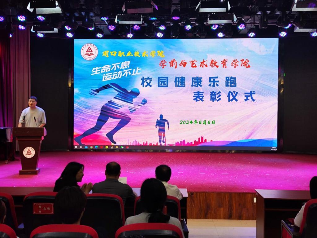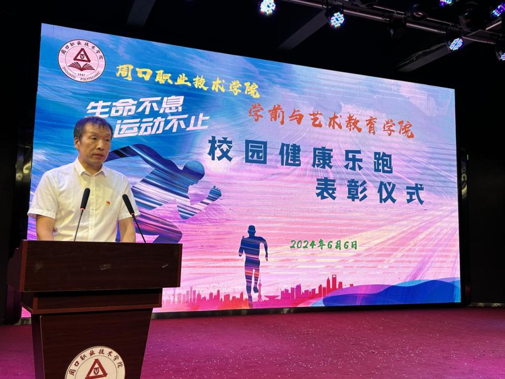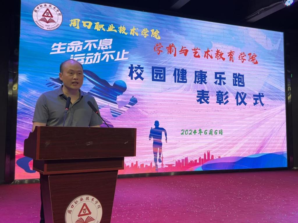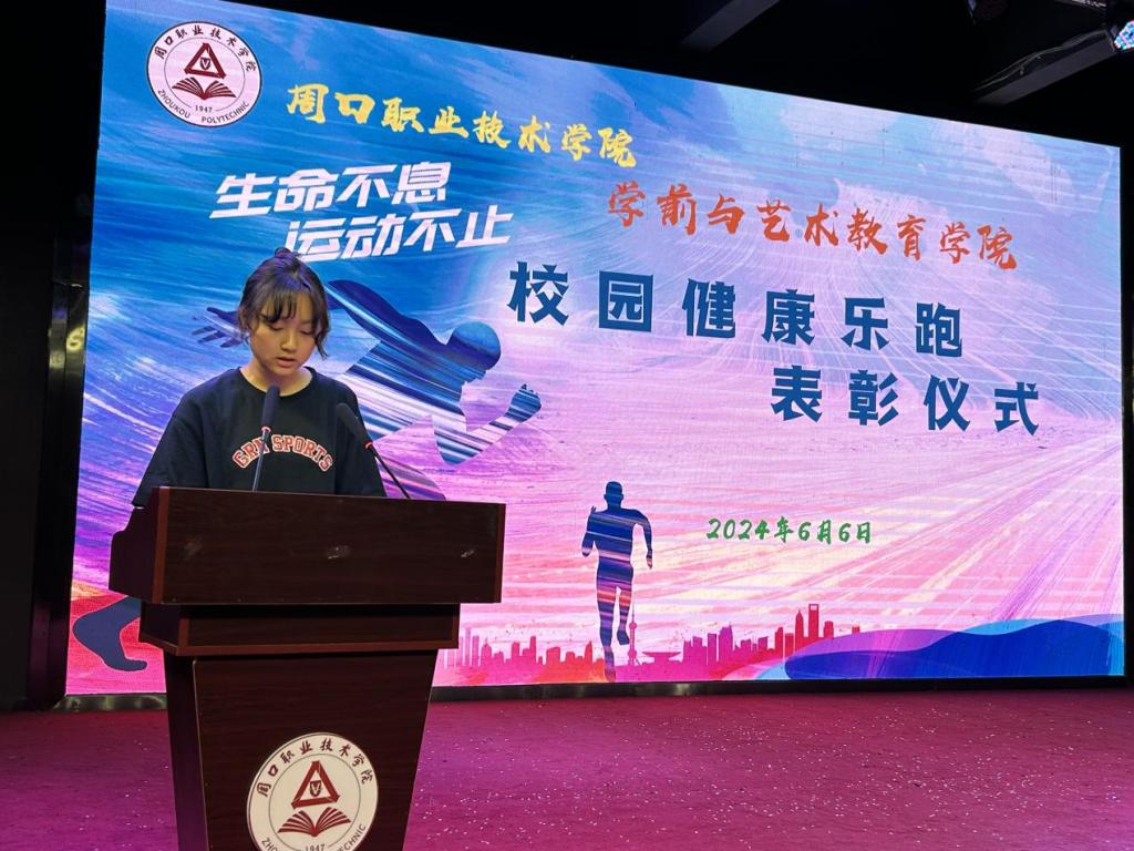 获奖代表23级学前教育三班魏涵熙发言,她向同学们介绍了跑步等运动对我们的好处,里程、配速,跑步中一次次的突破,一次次的超越,只为遇见更好的自己,希望同学们都能积极参与乐跑,享受乐跑,在认真学习的同时,不忘体育锻炼,以更好的精神面貌迎接未来的校园生活。