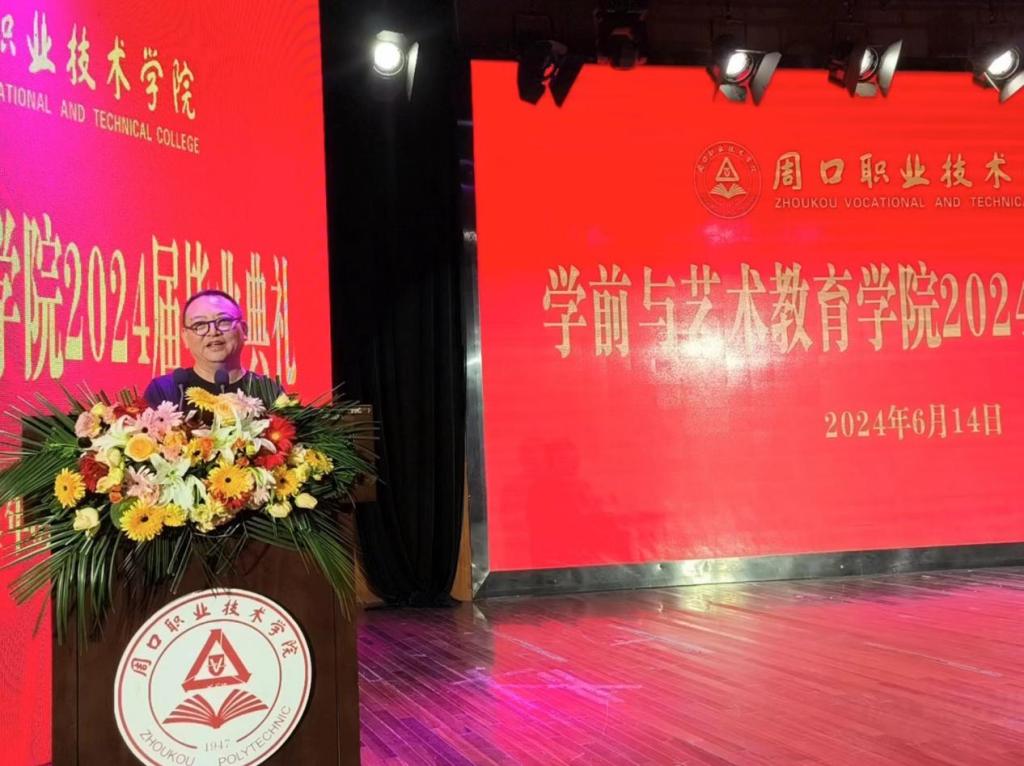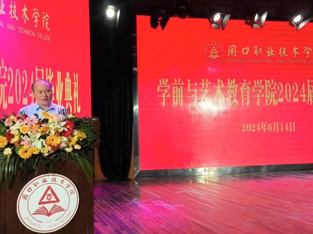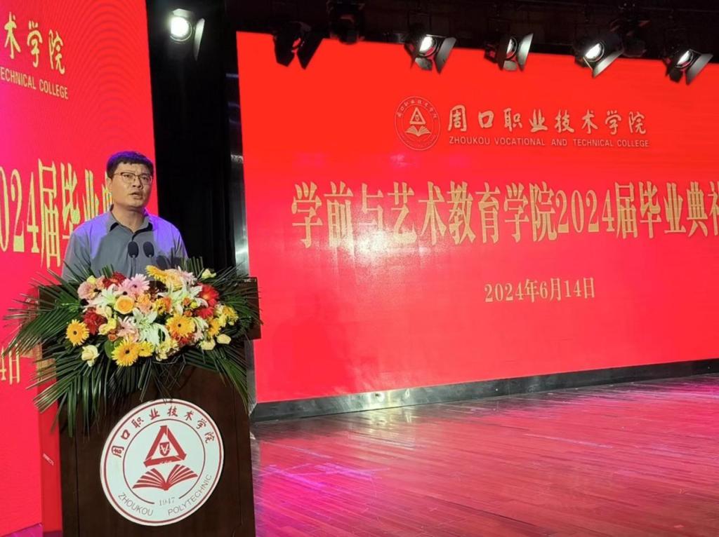 在校生代表2022级早期教育专业二班朱琳琳同学对那些即将踏上新旅程、揭开人生新章节的学长学姐们,致以最真挚的祝福。祝愿学长学姐们一帆风顺、前程似锦。同时,她表示将把他们作为楷模,勤奋学习,争取为学院的荣誉添砖加瓦。