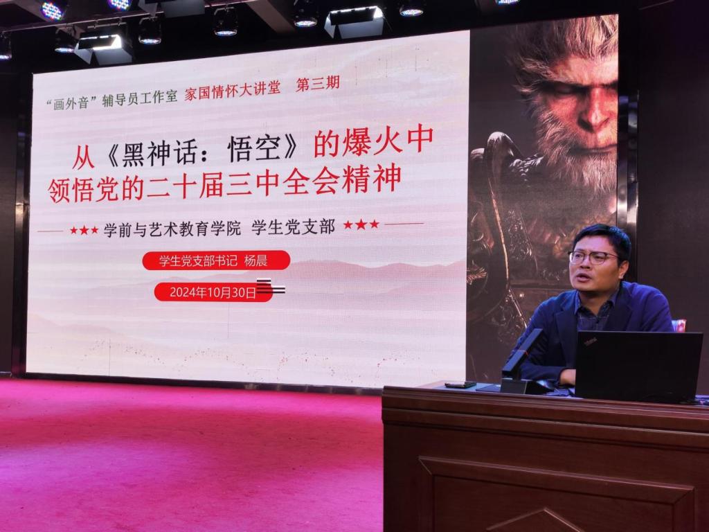 杨晨从“文化创新的路径、文化深度融合的典范、科技与文化的双向赋能、加强文化自信”等几个方面出发,讲述我国在经济、科技等领域逐步崛起,绘就辉煌成就的历史过程。同时,他还激励同学们深入学习党的理论知识,不断提升政治修养,坚守共产主义理想信念,积极传承中华民族的优秀传统文化。