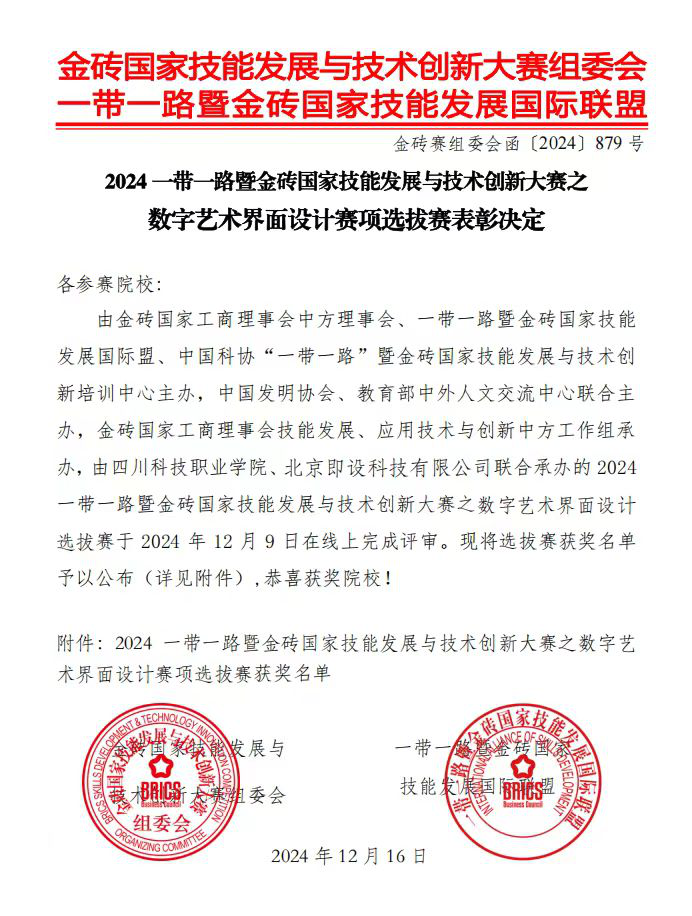 12月16日,2024一带一路暨金砖国家技能发展与技术创新大赛——数字艺术界面设计赛项选拔赛结果正式公布,贝博官网三支参赛团队脱颖而出。