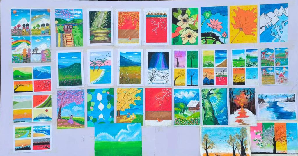 同学们在画纸上尽情挥洒自己对四季的理解和感悟,描绘出一幅幅充满童趣的美丽图画,一幅幅色彩鲜艳、生动活泼、栩栩如生的画面跃然纸上。