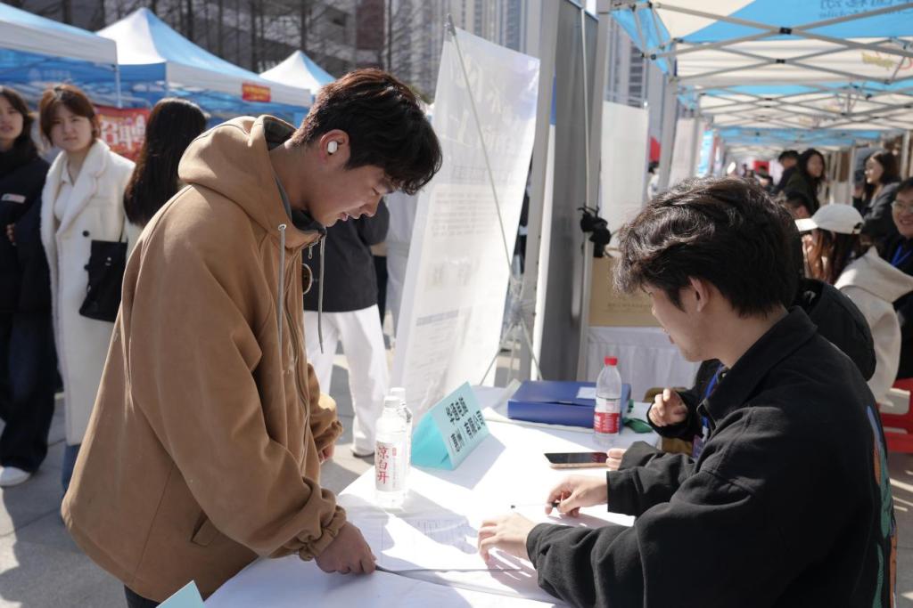 双选会现场气氛热烈,用人单位设立展板,展示各类招聘信息,招聘人员热情细致的讲解岗位要求与职业发展路径,同学们仔细聆听介绍,积极与招聘人员进行交流,认真思考未来职业规划。