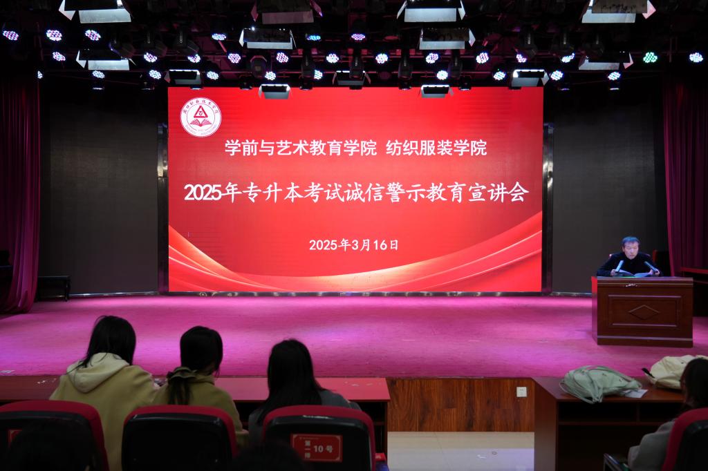 为端正考风,严肃考纪,3月16日上午,ballBET贝博BB艾弗森(纺织服装学院)在艺术演播厅召开2025年专升本考试诚信警示教育宣讲会。学院领导班子、22级辅导员以及学院22级全体专升本学生参加会议。