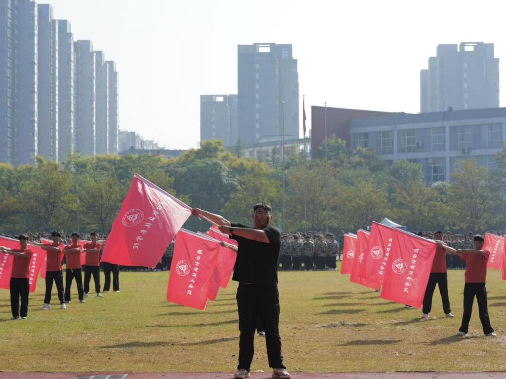看!巨幅国旗在炫彩烟幕里震撼铺展,同学们满含朝气托举着国旗阔步走来,红绸猎猎、烟彩飞扬,炽热画面瞬间点燃全场的热血与敬意,军训成果汇报仪式就此盛大启幕。