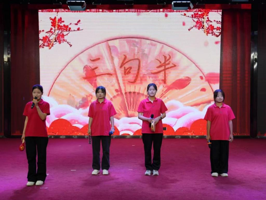 《三句半》表演趣味十足,四位同学用鲜活的语言、夸张的动作把校园趣事讲得活灵活现。
