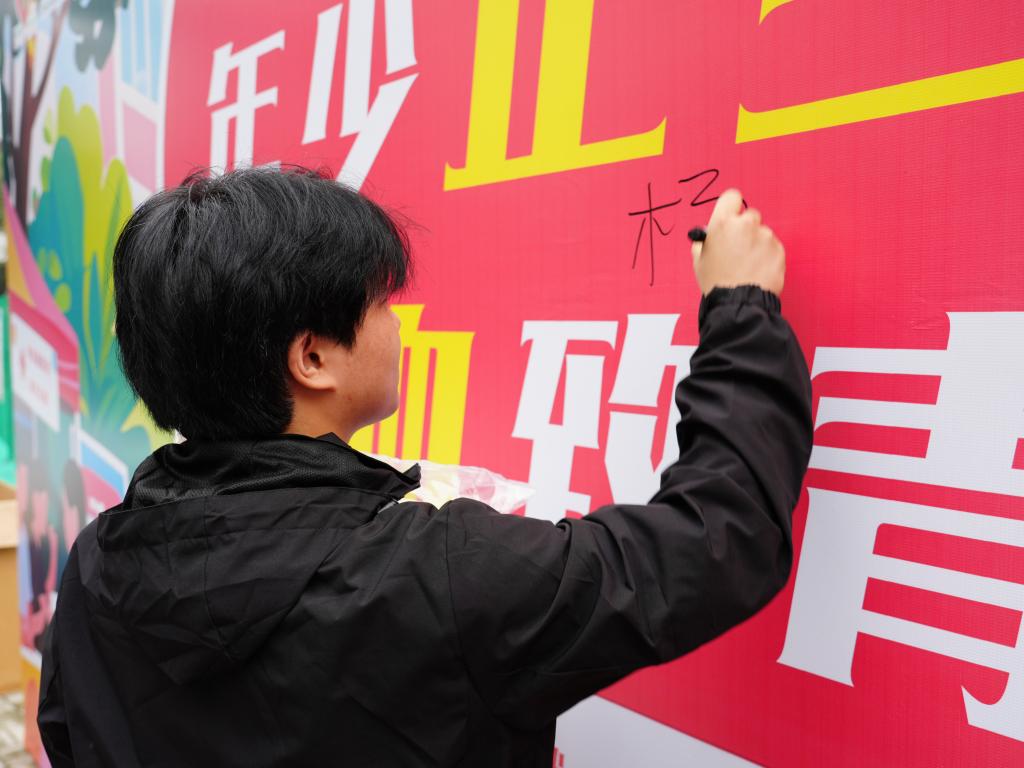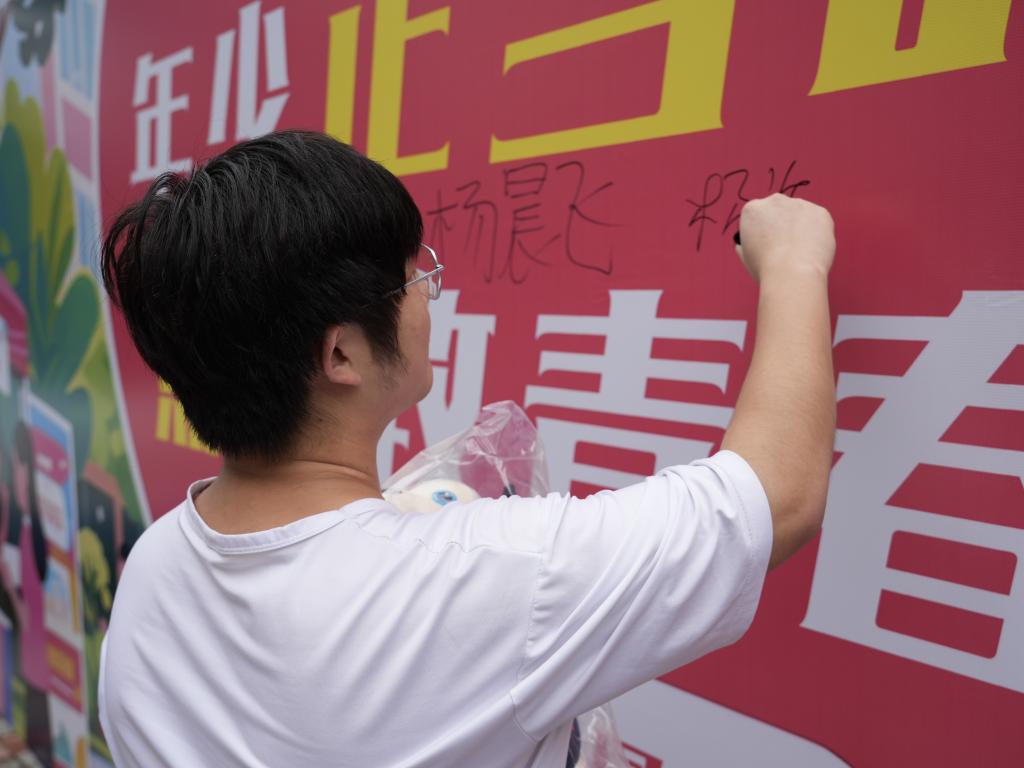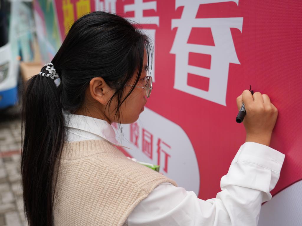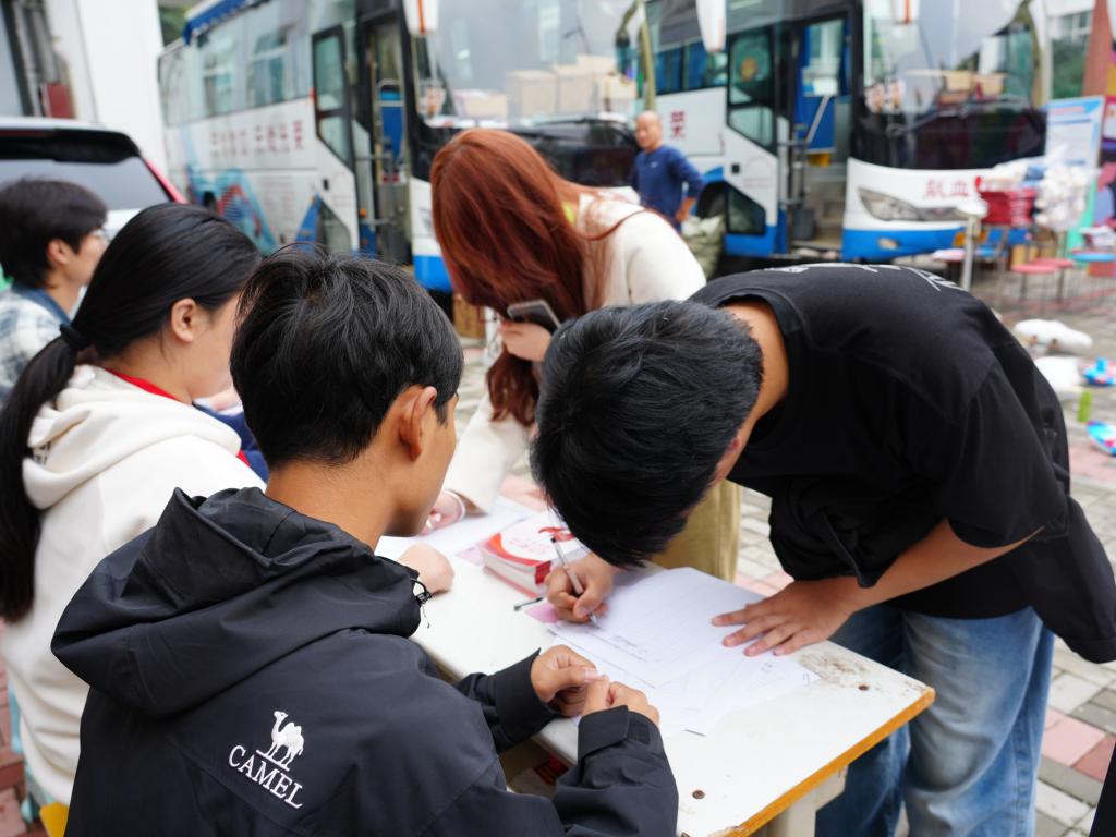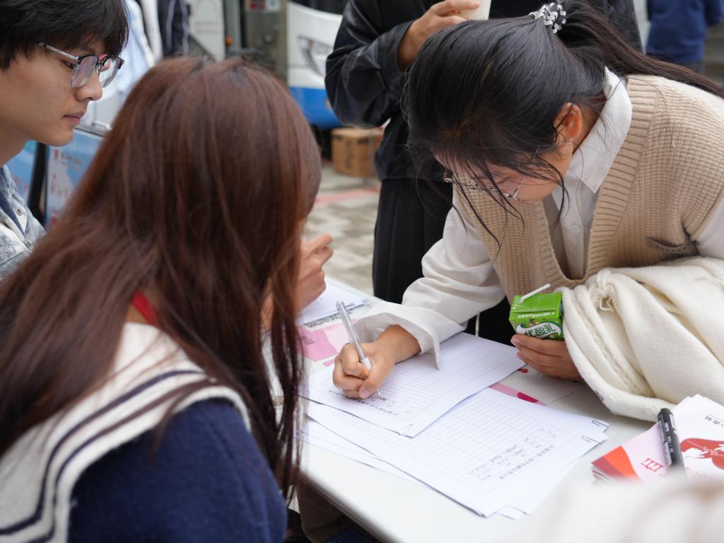 志愿者们围在桌前,仔细填写登记信息,每一笔都是对生命的敬意、对爱心的传递、对公益的郑重。随后他们在背景板上签下自己的姓名,落笔瞬间,便是热血青春应有的模样。