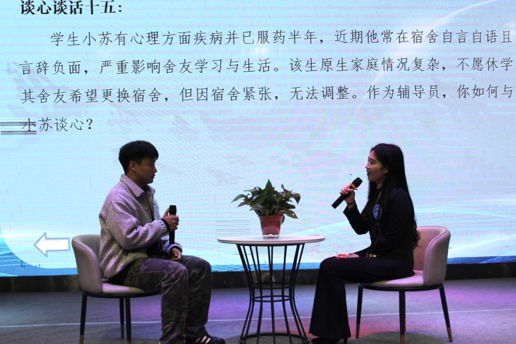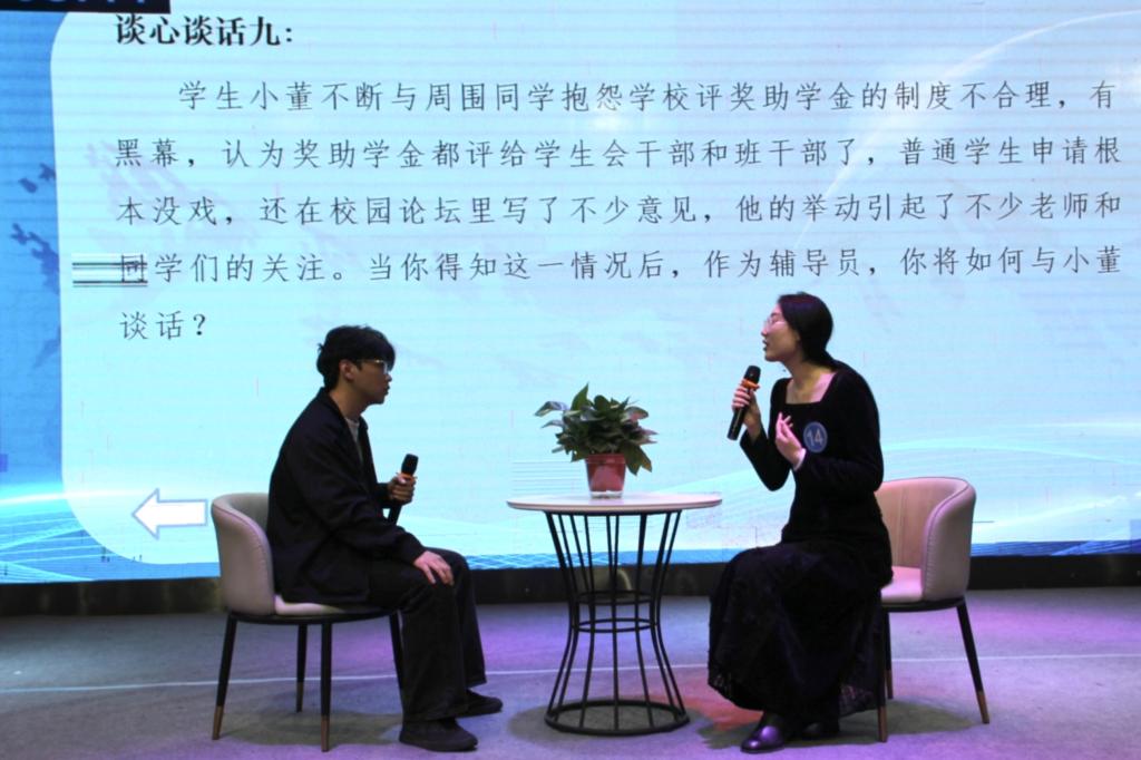 决赛设置案例研讨与谈心谈话两个环节,围绕学生管理、活动组织、沟通协调等核心能力,全方位考查辅导员的专业知识储备与职业素养。贝博官网史宇可、王莹两位辅导员在比赛中发挥出色:案例研讨环节,她们分析精准透彻、对策务实,尽显扎实的理论功底与专业研判能力;谈心谈话环节,她们精准把握学生诉求,以共情引导与疏解帮扶相结合的方式高效回应问题,兼具人文关怀与方法创新,充分彰显出贝博官网辅导员队伍过硬的专业素养与育人水平。