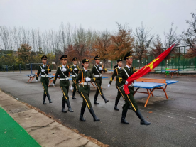 6点40分,升旗仪式开始,国旗护卫队迈着庄严而整齐的步伐走向国旗台,在《义勇军进行曲》激昂的旋律中,全体师生肃立,齐唱国歌,向五星红旗行注目礼。