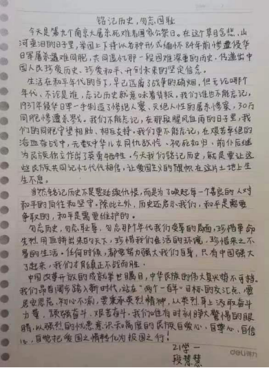 铭记苦难,永志不忘。同学们积极参与主题征文活动,牢记侵略战争给中国人民造成的深重灾难,加深同学们对南京大屠杀历史的了解。