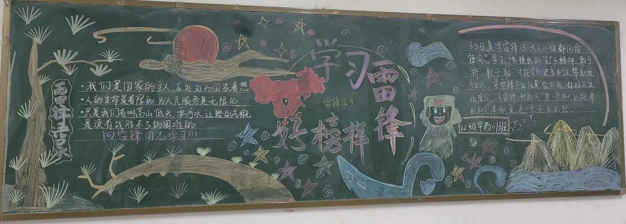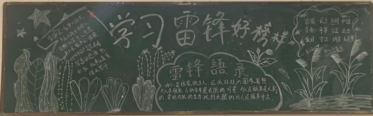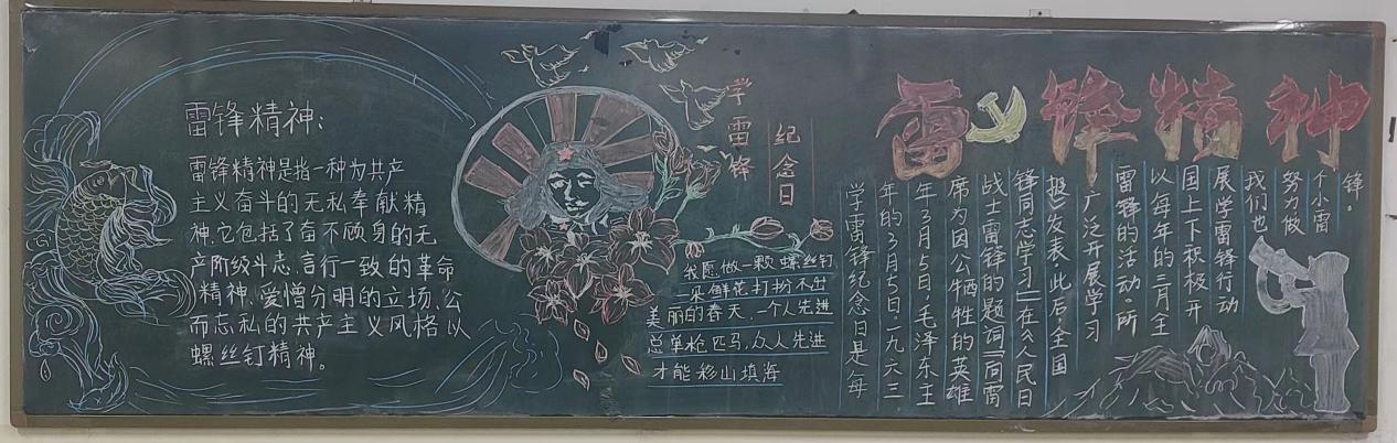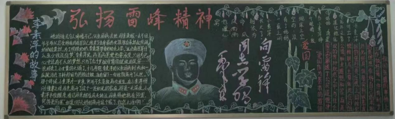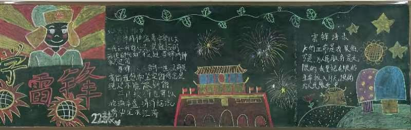 各班级积极参与,认真查找资料、精心设计,以主题突出、图文并茂的黑板报展示了同学们对雷锋的敬仰之情。黑板报追述了雷锋同志的光辉事迹,赞扬了他的“钉子”精神,歌颂了他全心全意为人民服务的品质。