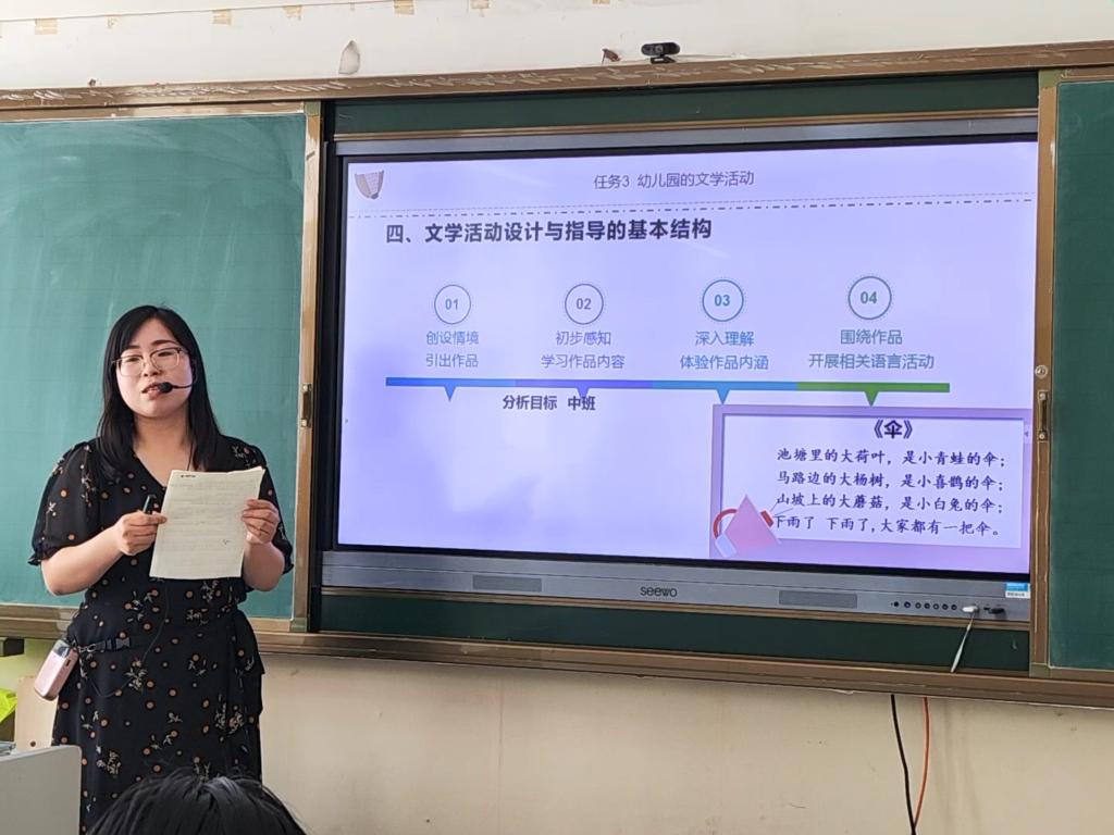 课堂上,沙老师首先结合学生课前线上学习情况,带领学生一起回顾了幼儿园教育活动设计的流程,然后组织学生进行幼儿园教育活动的模拟教学,学生模拟教学结束后,沙老师对学生的教学设计以及模拟教学的每一个环节进行了详细的点评,并亲自运用多种方法展示了模拟教学的关键环节。