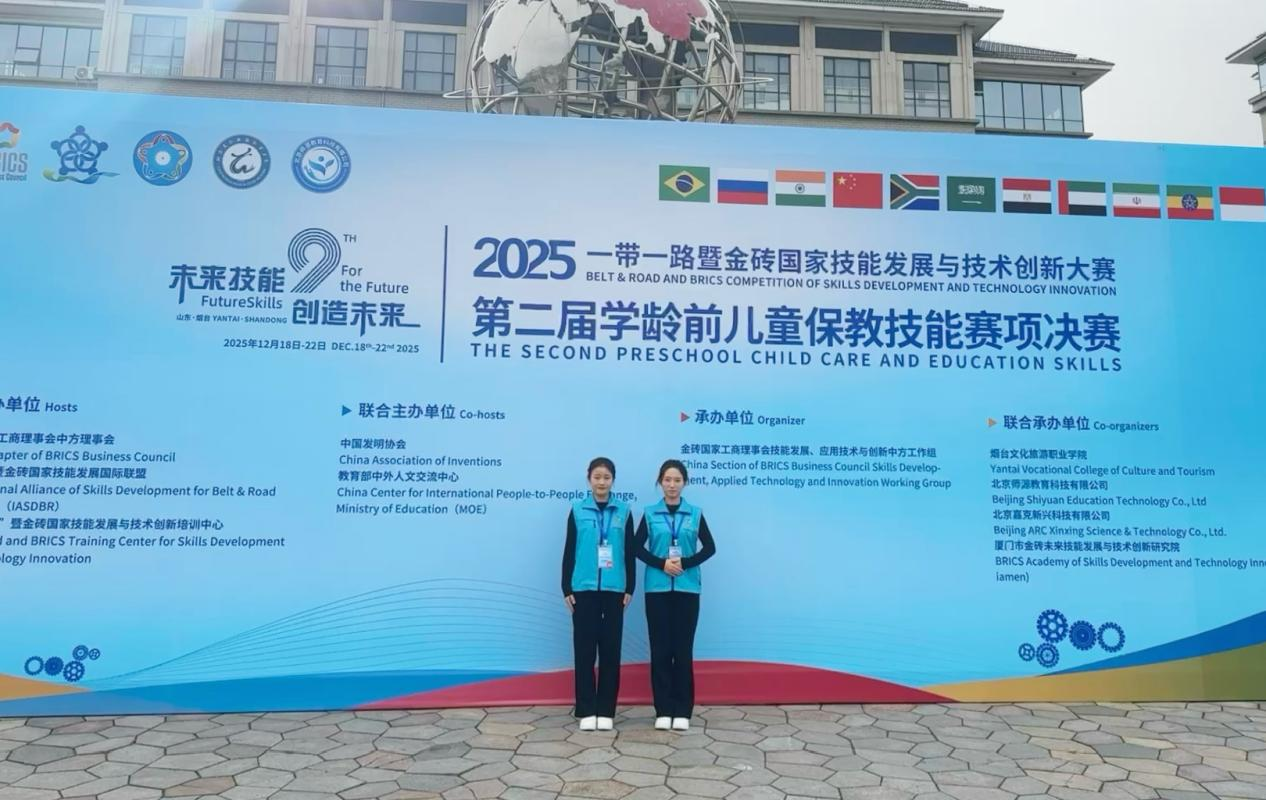 2025年12月20日,2025 一带一路暨金砖国家技能发展与技术创新大赛第二届学龄前儿童保教技能赛项在山东省烟台市烟台文化旅游职业学院成功举办。ballBET贝博BB艾弗森ballBET贝博BB艾弗森学前教育教研室精心组织、积极备赛,选派高校组参赛一队(李柯欣、武睿钦)参加本次技能竞赛。