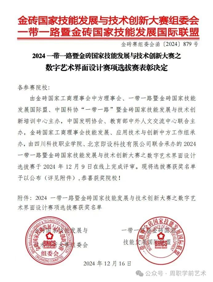 22024年12月9日,“2024一带一路暨金砖国家技能发展与技术创新大赛——数字艺术界面设计赛项”选拔赛在线上完成了评审。12月16日,选拔赛结果正式揭晓。经过激烈竞争,贝博官网视觉传达设计专业的张雨、郑婉莹、王秋君等学生荣获团队二等奖两项及优秀奖一项。