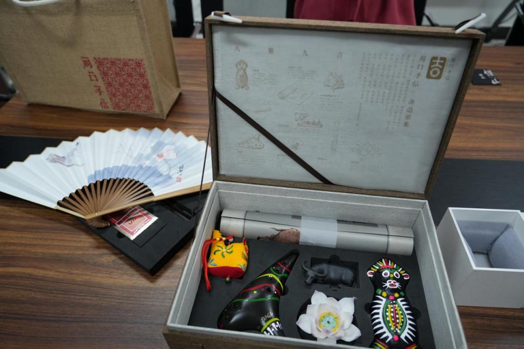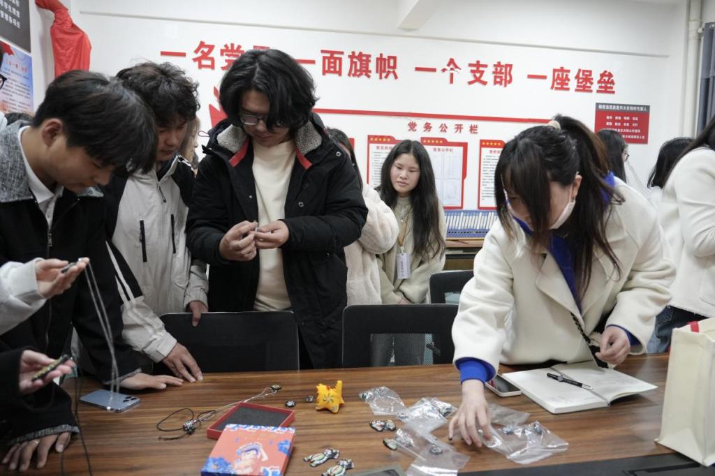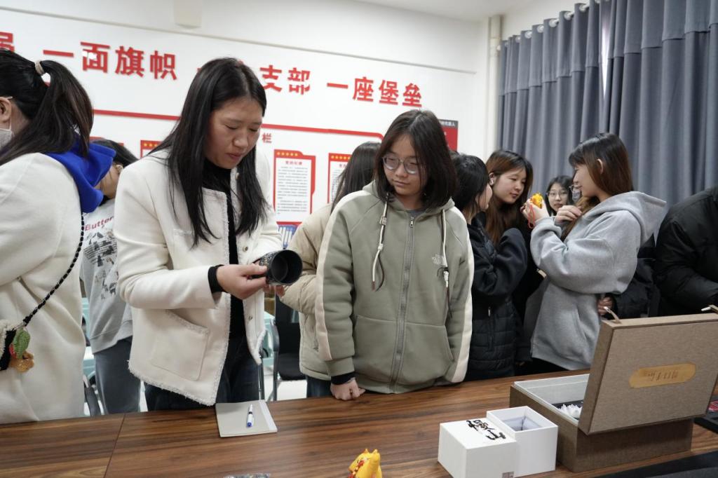 学生们观赏手信非遗文创作品,并展开热烈讨论。