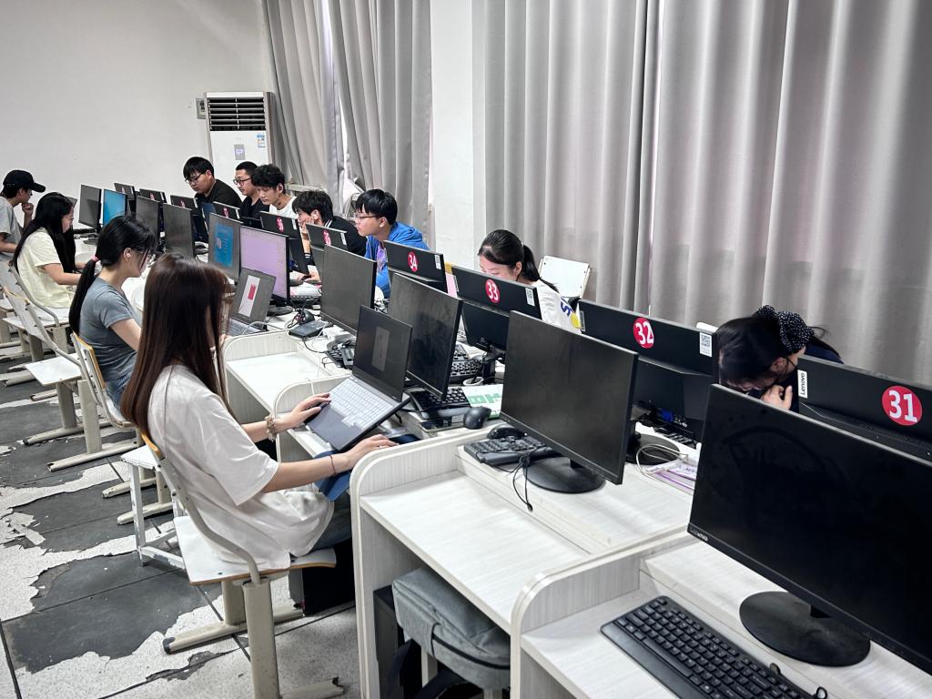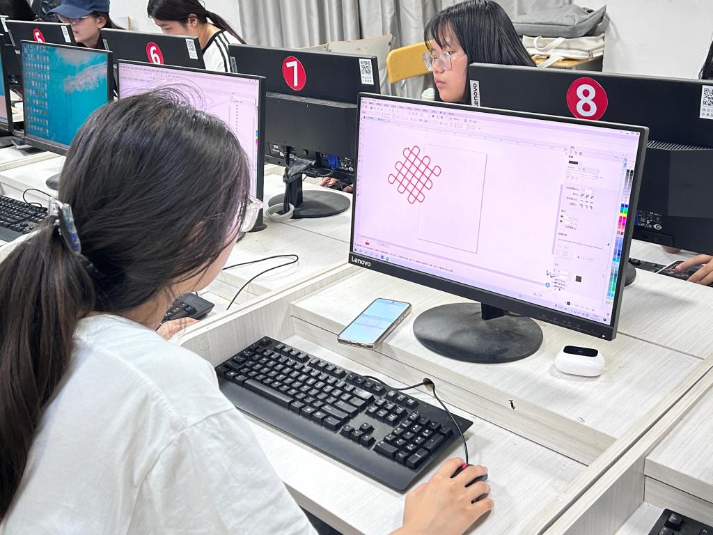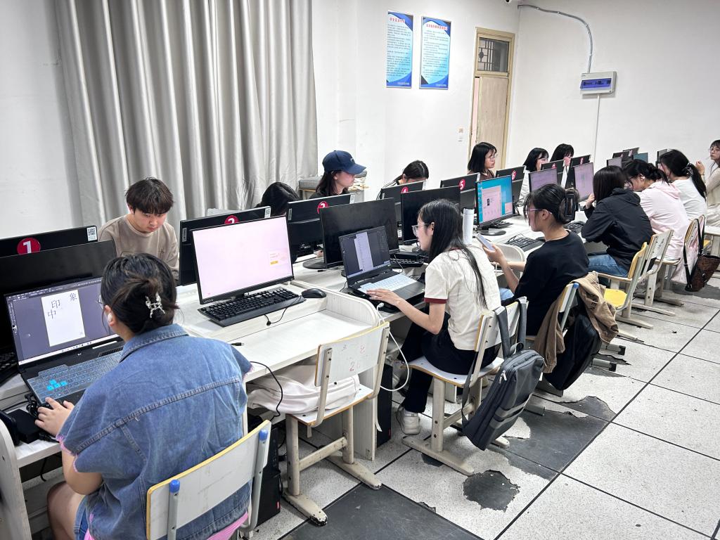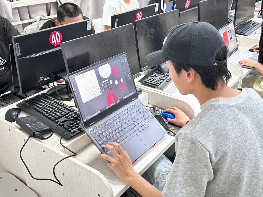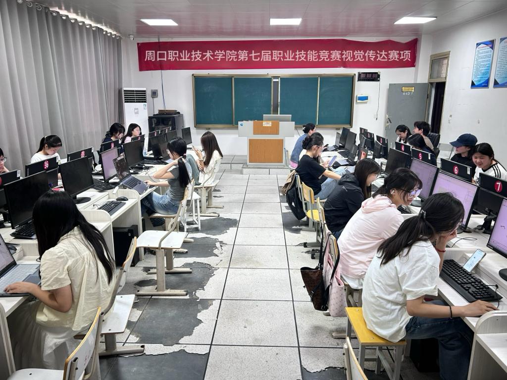 竞赛现场,学生严格对照评分标准,对海报构图、字体设计等内容进行多轮优化调整,以专业的设计素养和严谨、认真的态度完成创作。