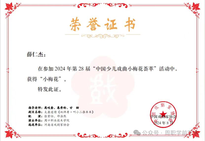 近日,第28届“中国少儿戏曲小梅花荟萃”活动圆满落幕,贝博官网戏曲表演专业学生薛仁杰在此次比赛中表现出色,凭借太康道情《双拜寿》中的经典片段“叫小二推车车”荣获“小梅花”称号,为贝博官网赢得了荣誉。