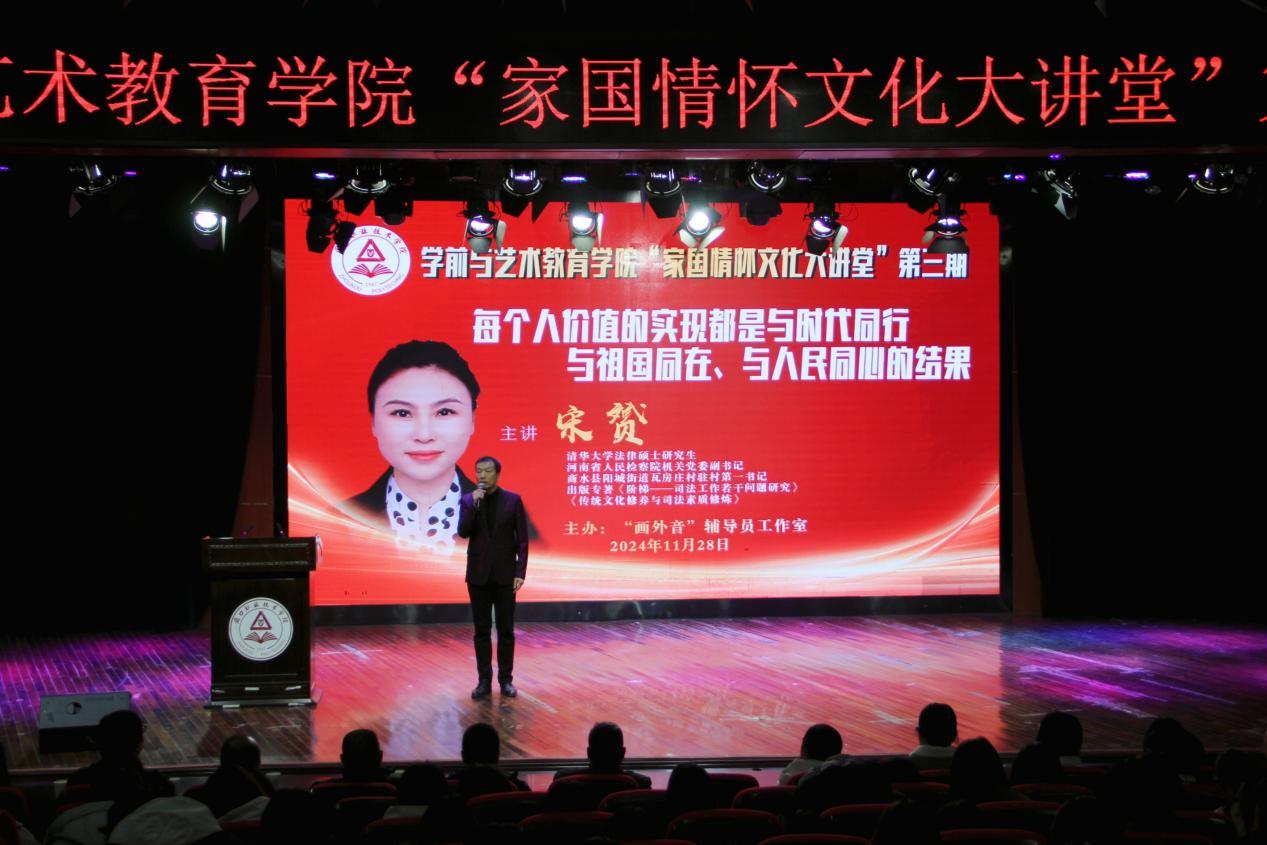 11月28日晚,由ballBET贝博BB艾弗森(纺织服装学院)“画外音”辅导员工作室主办的“家国情怀文化大讲堂”第三期专题讲座在砺德厅激情开讲。本期特邀清华大学法律硕士研究生、河南省人民检察院机关党委副书记、商水县阳城街道瓦房庄村驻村第一书记宋赟老师授课,校党委副书记李明臣出席,体育学院院长徐长宇、护理学院党总支书记孙先峰、医学院党总支书记苑建伟、ballBET贝博BB艾弗森院长高岐奎参加活动。学院党总支书记王春生主持。