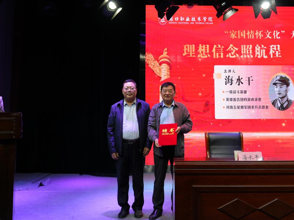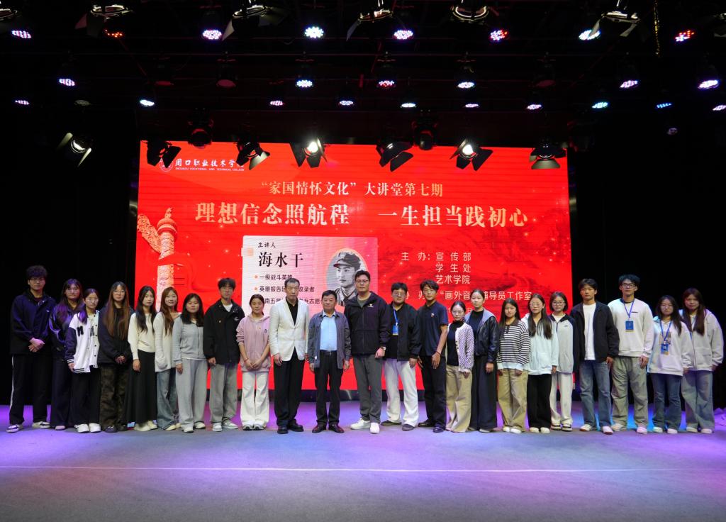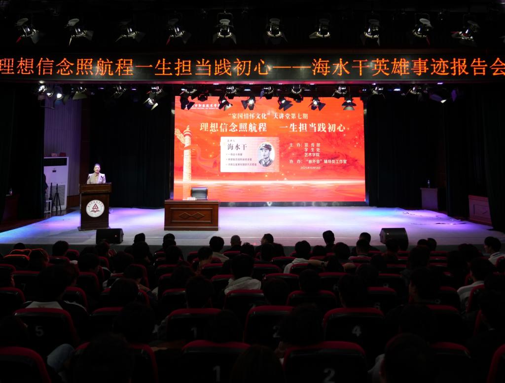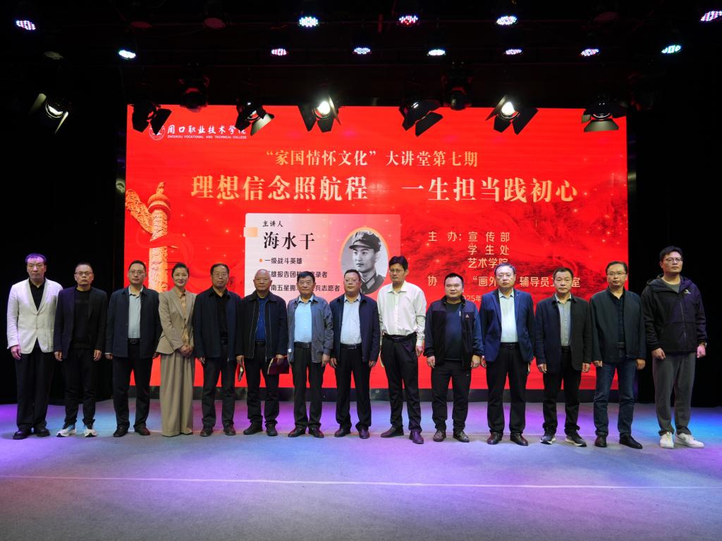 10月14日,由校党委宣传部、学生处和ballBET贝博BB艾弗森(纺织服装学院)主办,“画外音”辅导员工作室协办的“家国情怀文化”大讲堂第七期在砺德厅激情开讲。本期特邀一级战斗英雄、英雄报告团档案收录者、河南五星拥军团老兵志愿者海水干为主讲人。校党委副书记李明臣出席活动,各二级学院党总支书记、“画外音”辅导员工作室负责人参加活动,讲座由学生处处长刘冬霞主持。